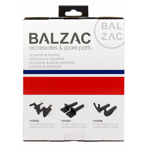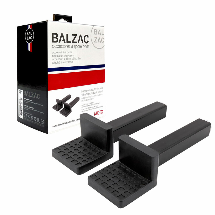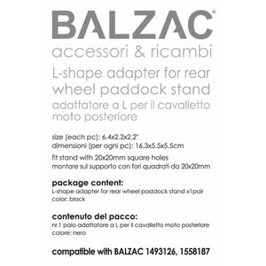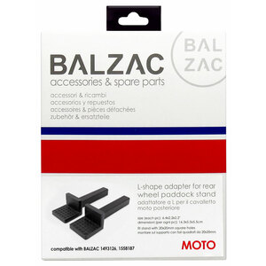 Adattatore ad "L" per cavalletto moto posteriore Balzac (compatibile con Balzac 1493126 e 1558187). Dimensioni (per ogni pezzo): 16,3x5,5x5,5cm. Montare su supporto con fori quadrati da 20x20mm