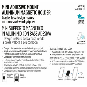 Mini supporto magnetico in alluminio con base adesiva. Il design rialzato senza base rende la presa veloce e più comoda. Placca con adesivo 3M. Realizzato in alluminio dialta qualità, design minimal. La confezione include: 1x supporto magnetico con adesivo 3M, 1x placca interna con adesivo 3M
