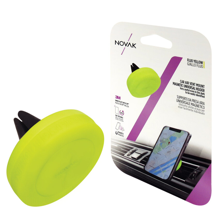 Supporto da presa d'aria universale magnetico. Edizione limitata! Colorazione giallo fluo per essere facilmente visibile anche al buio. Placca con adesivo 3M. Design semplice e pratico. Compatibile con la maggior parte degli smartphone. Lo smartphone può essere regolato orizzontalmente o verticalmente. Supporto magnetico con clip: 3,7x4,5cm Placca interna con adesivo 3M 6,5x4,5cm