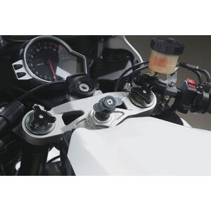 Attacco da canotto di sterzo moto. 3 adattatori inclusi per adattarsi a canotti da 12mm a 25,1mm. La sfera gommata permette di ridurre urti e vibrazioni. Sistema di fissaggio orientabile per trovare il miglior angolo di visione. Struttura in metallo presso fuso ad alta resistenza. Sistema di aggancio/sgancio rapido DuoLock. Compatibile con tutte le custodie Optiline (custodia non inclusa)