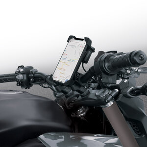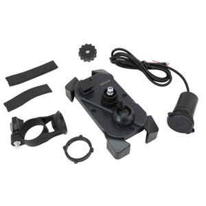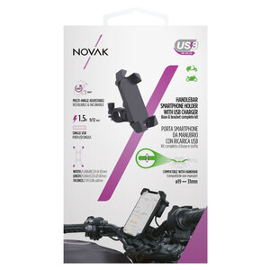 Porta smartphone da manubrio con ricarica USB. Kit completo di base e staffa. Comaptibile con manubri aventi diametro 19>31mm Regolabile e inclinabile. Carica lo smartphone durante la guida. Evita di trovarti senza batteria. Cuscinetto in EVA antiscivolo per evitare vibrazioni e graffi. Porta USB singola 1,5A 9/12V Larghezza: 61/83mm Lunghezza: 123-167mm. Spessore: <10mm