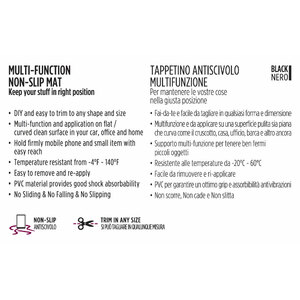 Tappetino antiscivolo multifunzione. Fai-da-te e facile da tagliare in qualsiasi forma e dimensione. Multifunzione e da applicare su una superficie pulita sia piana che curva come il cruscotto, casa, ufficio, barca e altro ancora. Supporto multi-funzione per tenere ben fermi piccoli oggetti. Resistente alle temperature da -20°C - 60°C. Facile da rimuovere e ri-applicare. PVC per garantire un ottimo grip e assorbimento delle vibrazioni. Non scorre. Non cade. Non slitta