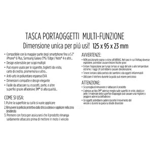 Tasca portaoggetti milti-funzione, estensibile. Dimensione unica per più usi. Con accesso alla presa di ricarica. Compatibile con la maggior parte degli smartphone fino a 5,7", iPhone, Samsung Galaxy/Galaxy Edge, Note 4 e altri. Design estensibile per scopi multipli. Puo' essere usato per le sigarette, biglietti da visita, carte di credito, promemoria e altro.. Anti-urto in poliuretano espanso EVA. Dimensioni compatte e design elegante. Facile da attaccare su cruscotti, porte e altre superfici grazie all'adesivo 3M di alta qualità