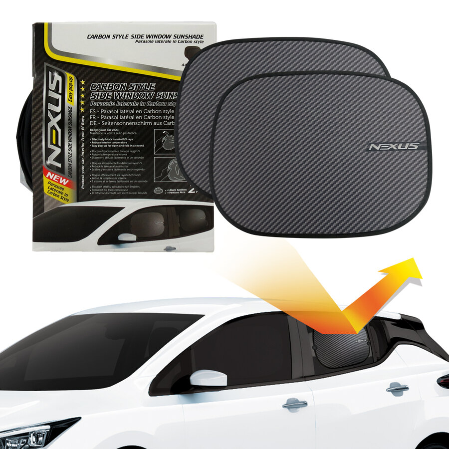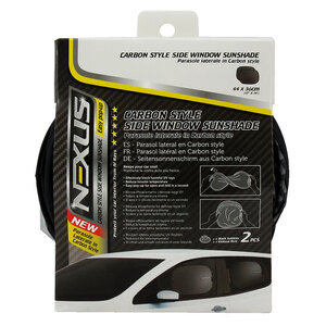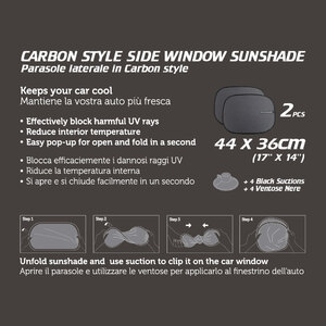 Parasole laterale Carbon Style. Aiuta a mantenere la vostra auto più fresca. Blocca efficacemente i dannosi raggi UV. Riduce la temperatura interna. Si apre e si chiude facilmente in un secondo. 4 ventose incluse