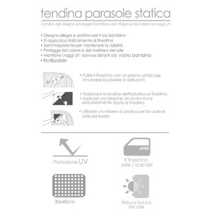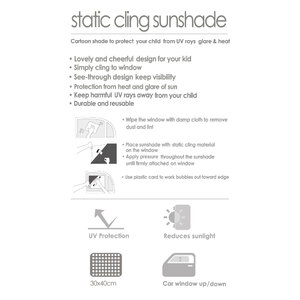 Tendina parasole statica. L'ombra del disegno protegge il tuo bambino dal riflesso e dal calore dei raggi UV. Applicazione immediata al vetro. Disegno allegro e positivo per il tuo bambino. Semi-trasparente per mantenere la visibilità. Protegge dal calore e dal riverbero del sole. Mantiene i raggi UV dannosi distanti dal bambino. Riutilizzabile