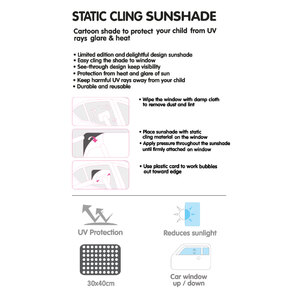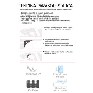 Tendina parasole statica. L'ombra del disegno protegge il tuo bambino dal riflesso e dal calore dei raggi UV. Edizione limitata. Design super cool. Applicazione immediata al vetro. Semi-trasparente per mantenere la visibilità. Protegge dal calore e dal riverbero del sole. Mantiene i raggi UV dannosi distanti dal bambino. Riutilizzabile