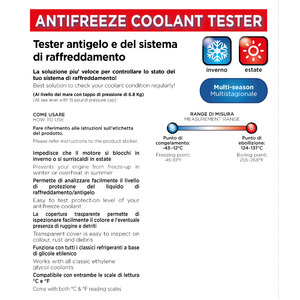 Tester antigelo e del sistema di raffreddamento. La soluzione più veloce per controllare lo stato del tuo sistema di raffreddamento. Impedisce che il motore si blocchi in inverno o si surriscaldi in estate. Permette di analizzare facilmente il livello di protezione del liquido di raffreddamento/antigelo. La copertura trasparente permette di ispezionare facilmente il colore e l'eventuale presenza di ruggine e detriti. Funziona con tutti i classici refrigeranti a base di glicole etilenico. Compatibile con entrambe le scale di lettura °C e °F. Range di misura: punto di congelamento del liquido -43 / -12°C; -45 / +10°F; punto di ebollizione 125 - 131°C; 257 / 268°F