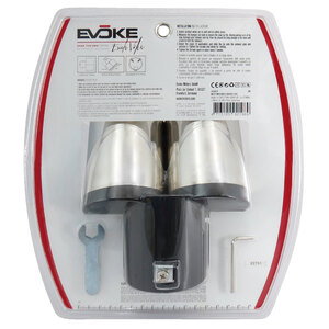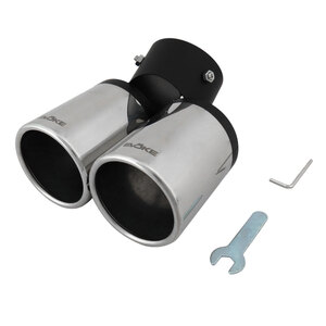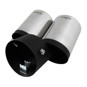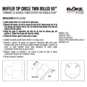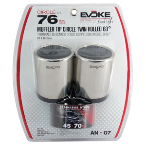 Terminale di scarico tondo doppio 2x76mm con angolo di 60°. Adatto per scarichi con uscita diam. 45>70mm. Lunghezza: 169mm. Ingresso: 74mm Installazione: raccordo a vite. Acciaio inossidabile di alta qualità. Non necessita di saldature e trapanature. Universale: si adatta alla maggior parte delle uscite delle marmitte. Sistema di fissaggio incluso