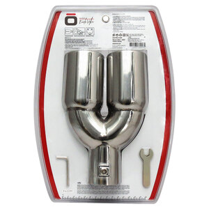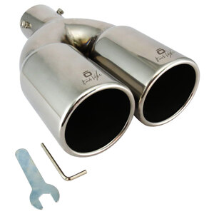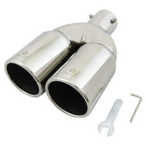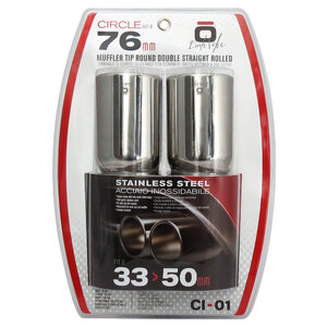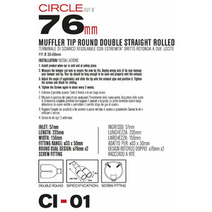 Terminale doppio tondo 2x76mm. Adatto per scarichi con uscita 33>50mm. Ingresso: 57mm. Lunghezza: 235mm Larghezza: 156mm Installazione: raccordo a vite. Design unico a doppio cerchio con bordi laminati. Acciaio inossidabile di alta qualità. Non necessita di saldature e trapanature. Universale: si adatta alla maggior parte delle uscite delle marmitte. Sistema di fissaggio incluso