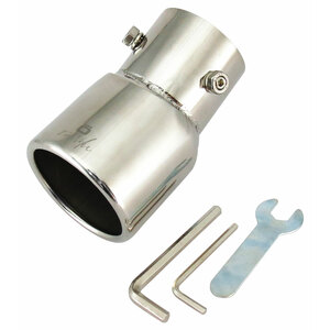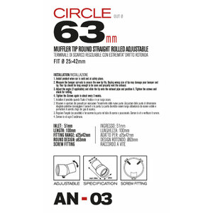 Terminale tondo 63mm, regolabile. Adatto per scarichi con uscita da 25>42mm. Ingresso: 51mm. Lunghezza: 100mm Installazione: raccordo a vite. Design regolabile per adattarsi alle uscite delle marmitte che sono rivolte verso il basso. Acciaio inossidabile di alta qualità. Non necessita di saldature e trapanature. Universale: si adatta alla maggior parte delle uscite delle marmitte. Sistema di fissaggio incluso