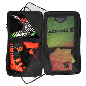Borsone. Volume 105lt Ruote 92mm diametro, larghezza 29mm. Inserti rigidi che permettono alla borsa di stare in posizione anche se vuota. Sistema con manico telescopico doppio tubo. Doppia maniglia centrale, una superiore ed una laterale. Tasca esterna porta documenti/telefono. Porta badge esterno. Inserti e loghi rifrangenti per migliore visibilità. Cerniera principale con doppio cursore per bloccare. Rinforzo in gomma pesonalizzato sul fondo. Scomparto superiore con tasca e cinghie ferma abiti. Scomparto inferiore speciale per casco e stivale. Fodera colore chiara per poter visualizzare facilmente il materiale all'interno. Tasche in rete e fori per ventilazioni