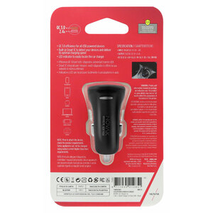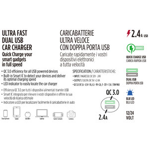 Caricabatterie ultraveloce con doppia porta USB. Caricate rapidamente i vostri dispositivi elettronici a tutta velocità. Led blue. Ecienza QC 3.0 per tutti i dispositivi alimentati tramite USB. Smart IC integrato per rilevare i vostri dispositivi e offrire la sua velocità di ricarica ottimale. Indicatore a LED per localizzare facilmente il caricabatterie in auto. Input: 12/24V. Output: DC 5V 2.4A. QC 3.0: DC 3.6 - 6.5V 3A, 6.5 - 9V 2A, 9 - 12V 1.5A / 18W max
