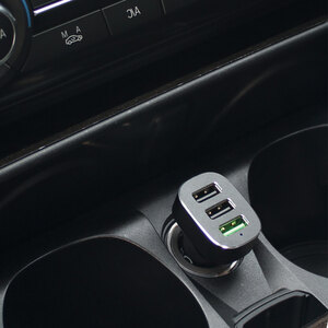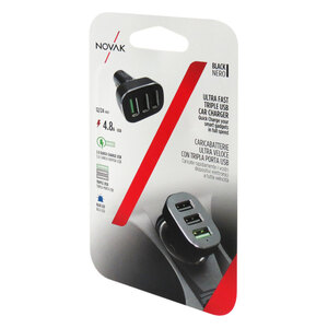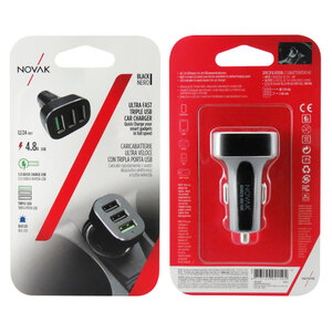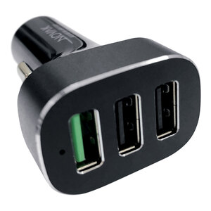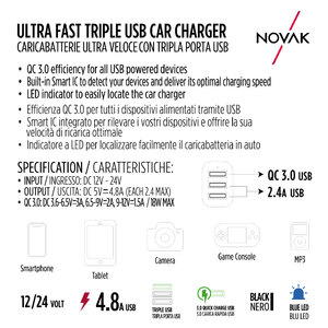 Caricabatterie ultra veloce con tripla porta USB. Alimentate i vostri dispositivi in modo rapido ed efficiente. Efficienza QC 3.0 per tutti i dispositivi alimentati tramite USB. Smart IC integrato per rilevare i vostri dispositivi e offrire la sua velocità di ricarica ottimale. Indicatore a LED blue per localizzare facilmente il caricabatteria in auto. Input: DC 12/24V Uscita DC 5V- 4,8A (each 2.4 MAX). qc3.0: dc 3.6-6,5V/3A; 6.5-9V/2A; 9-12V/1.5A 18W Max