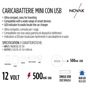 Caricabatterie mini con USB. Alimentate i vostri dispositivi in modo rapido ed efficente. Ultra compatto comodo per i viaggi. Compatibile con una vasta gamma di dispositivi elettronici. Indicatore a LED per localizzare facilmente il caricabatterie in auto. Ingresso: DC 12V Uscita: DC 5V-500mA