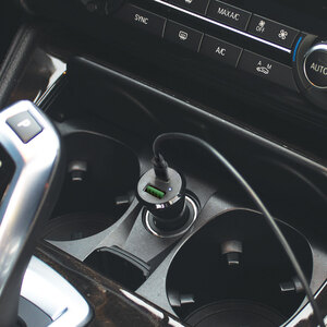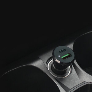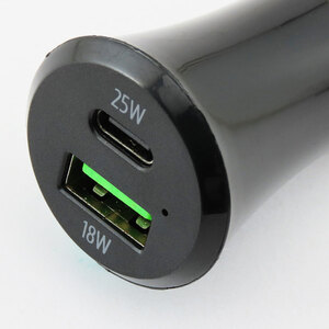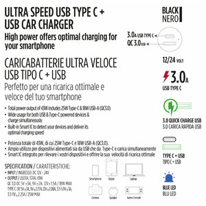 Caricabatterie ultra veloce USB Type C + USB. Perfetto per una ricarica ottimale e veloce del tuo smartphone. 3.0 carica rapida USB. Potenza totale di 43W, di cui 25W Type-C e 18W USB-A (QC3.0). Ampio utilizzo per dispositivi alimentati sia da USB che da Type-C e carica simultaneamente. Smart IC integrato per rilevare i vostri dispositivi e offrire la sua velocità di ricarica ottimale. Ingresso: DC 12V - 24V. Uscita: total 43W. QC 3.0: DC 5V 3A, 9V 2A, 12V 1.5A / 18W max, Type C: DC 5V 3A, 9V 2.77A, 12V 2.08A, 3.3-5.9V 3A, 3.3-11V 2.25A / 25W max