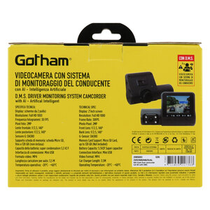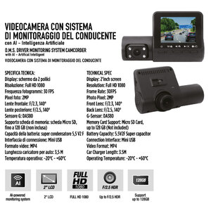 DashCam con DMS (Driver Monitoring System) e AI (Intelligenza Artificiale). Grazie all' AI è in grado di rilevare attivamente comportamenti di guida rischiosi e non sicuri. D.M.S.: è l'assistenza alla guida che utilizza sensori, telecamere e la tecnologia AI per supportare il conducente compiendo azioni concrete per aumentare la sicurezza durante la guida. Oltre a rilevare pericoli esterni, estende il raggio d'azione all'interno dell'abitacolo e con l'ausilio dell'IA rileva ed analizza i movimenti delle palpebre, la direzione dello sguardo, la posizione del corpo, ecc valutando in modo dinamico l'attenzione, l'affaticamento e la prontezza alla guida. Display 2". Ris.Full HD 1080. Eccellente visione notturna, LED integrato. Registrazione in loop senza soluzione di continuità, rilevamento del movimento, Sensore G DA380, monitoraggio nel parcheggio. Freq.fotogrammi: 30FPS. Lenti: fronte F/2.3, 140°; post. F/2.5, 140°. MiscroSD max 128GB (non inclusa). Batteria: 5,5 V2 F. Video: MP4