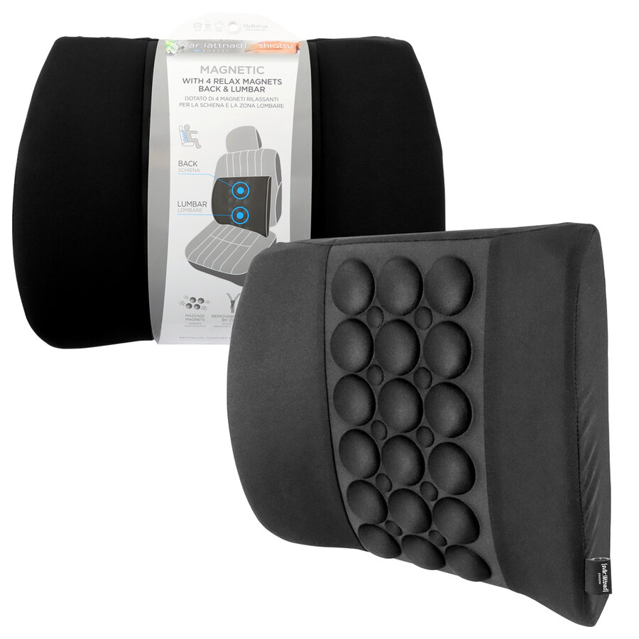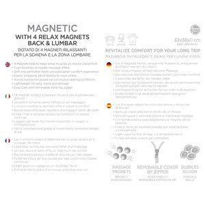 Dotato di 4 magneti rilassanti. Utile per la schiena e per la zona lombare. Ideale per lunghi viaggi. Con magneti massaggianti. Rivestimento removibile dotato di zip. Design a bolle. I 4 magneti aiutano a rilassare i muscoli tesi e ad alleviare i disturbi. Le bolle in schiuma danno l'effetto di un massaggio. Il tessuto morbido e ventilato ore il massimo comfort. Banda elasticizzata per adattarsi alla maggior parte dei sedili. Evita il mal di schiena causato da condizioni di seduta continua. Leggero per esser facilmente trasportato in viaggio o immagazzinato. Facile manutenzione grazie al rivestimento removibile dotato di zip